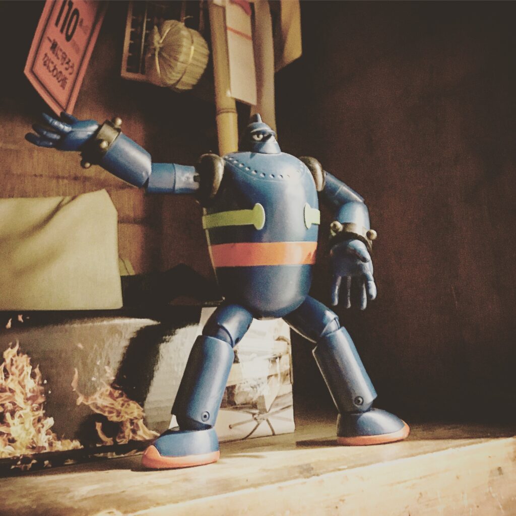 じつはその棚をお願いするのは店舗をデザインしてくれたslymedesignさん。打ち合わせのために事務所に向かうと昭和初期のレトロな建物、1階のショールームを抜けて2階に上がる、今時なら考えられないほど急な階段の手前にこの鉄人28号がいた!というわけです。